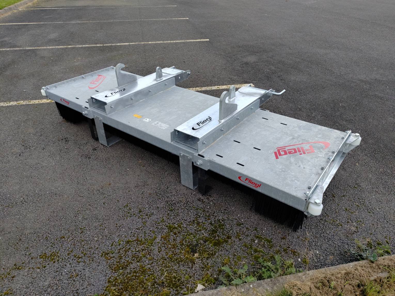 Balai avec 8 séries de balai en plastique 2500 mm, À fixer sur un attelage aux normes européennes ou sur chariot élévateur, intégralement galvanisée pour une protection optimale contre la rouille, galets de glissement lateraux pour approche des murs