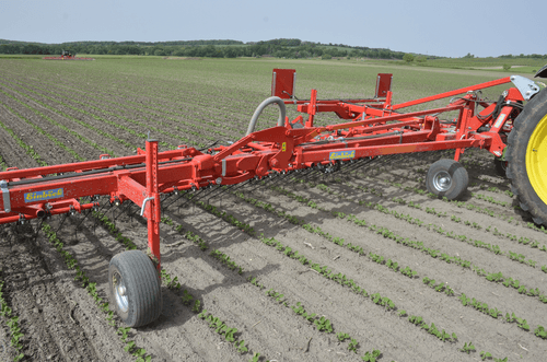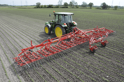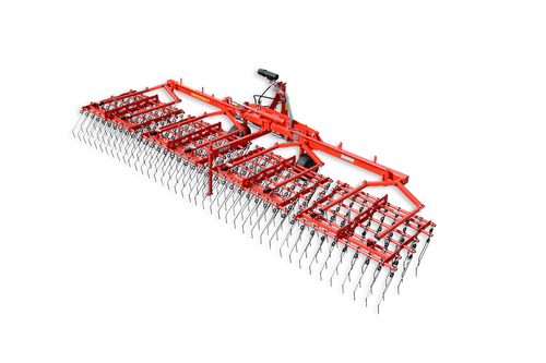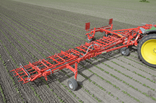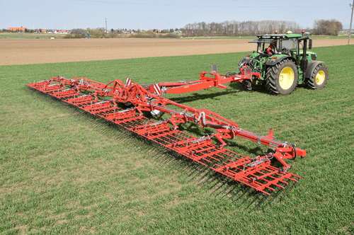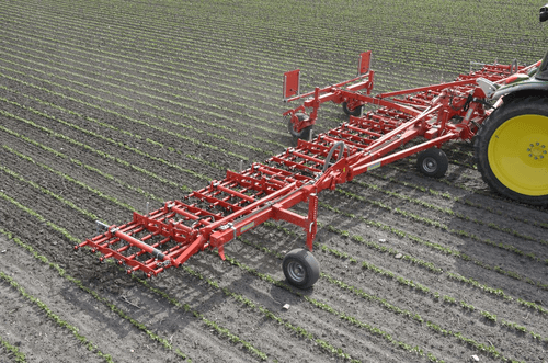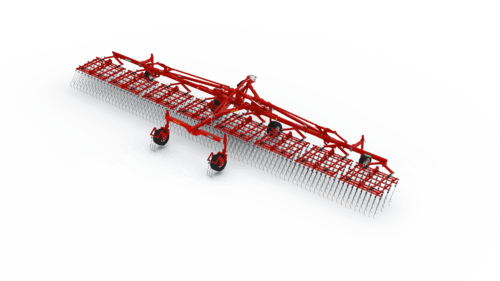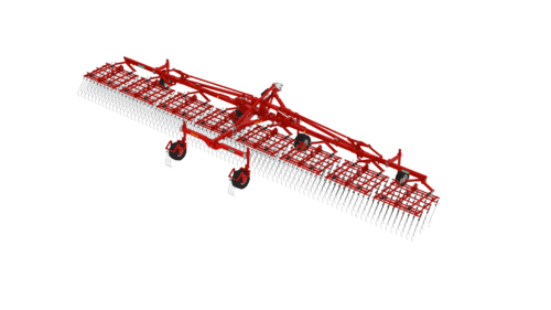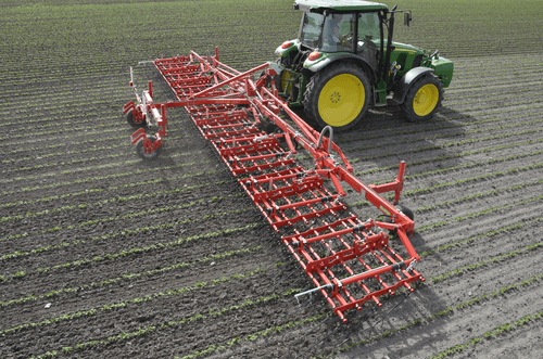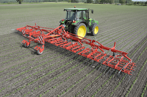 Dents individuelles de 7 mm, jusqu’à 530 mm de passage (pour culture haute et buttes), réglage hydraulique de l’agressivité (jusqu’à 6 kg de pression par dent), châssis fermé qui s’adapte parfaitement au sol, repliage facile, silencieux même à vitesse élevée. Largeurs de travail de 2 m à 15 m. Choix d’équipements en option.