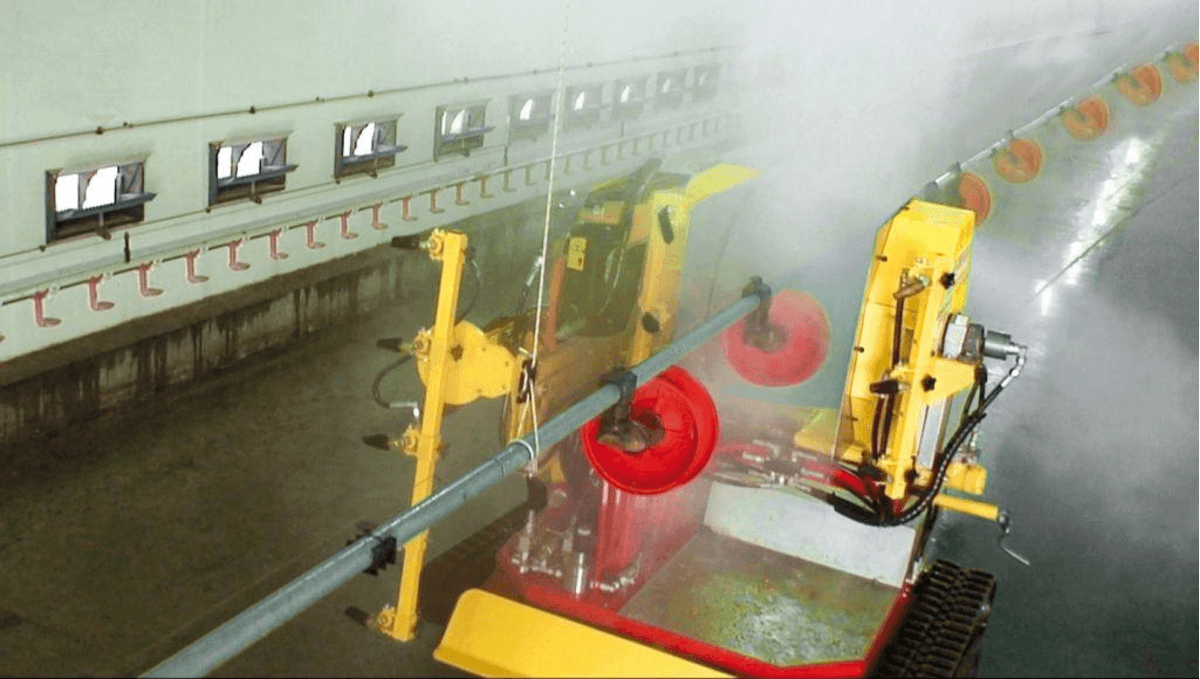 La laveuse de bâtiments avicoles LAVICOLE est montée sur un chenillard totalement radiocommandé qui permet le travail sur béton comme sur fumier. Quatre dispositifs de lavage permettent un lavage de qualité et complet du bâtiment :
