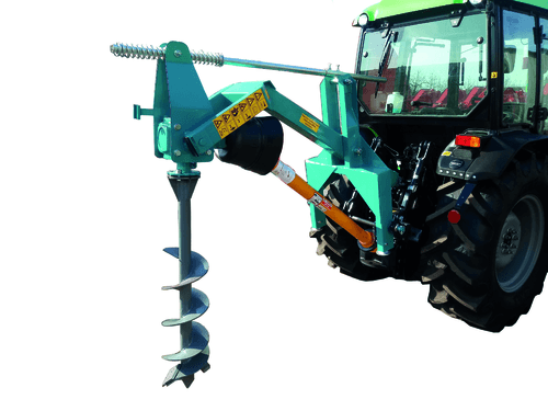 Tarière à terre attelage 3 points cat. II avec cadre et transmission.