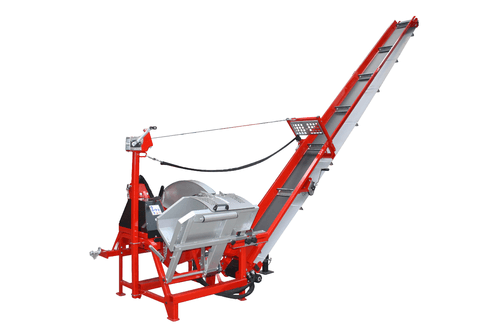 Scie circulaire à chevalet avec tapis monte bois. PDF tracteur 380 tr/min, tapis longueur 5 m, hauteur...