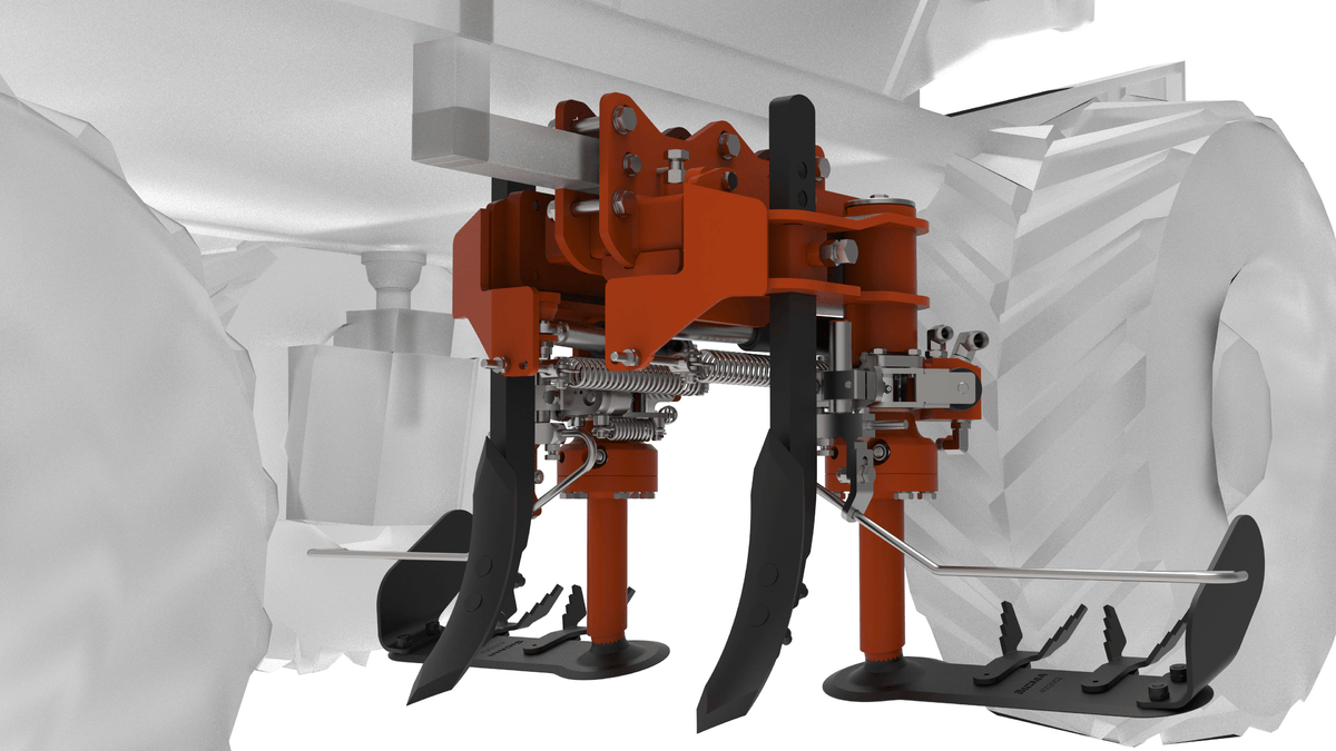 Porte outils SMART pour tracteurs enjambeurs ou automoteurs avec montage de disques émotteurs ou lames interceps.