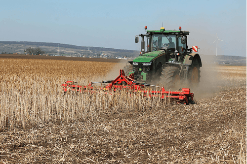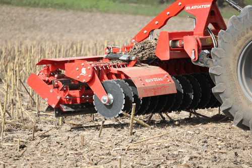 GLADIATOR est un outil frontal qui réunit un rouleau avec couteaux et disques tranchants. Cette combinaison de coupe horizontale et verticale permet de briser les résidus après récoltes et les cultures dérobées en une seule action. Châssis bipoutre acier HARDOX® suédois. Tête d’attelage avant et arrière pour travailler en combinaison avec un cultivateur ou un déchaumeur. Il a été particulièrement conçu pour colza, soja, tournesol, maïs et maïs d‘ensilage après récolte ainsi que pour la destruction de couverts. Lames de 100 mm réversibles, disques tranchants Ø 410 mm.