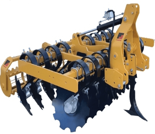 Ces déchaumeurs à disques Discosol ont une largeur de travail de 1,50 m à 3 m en fonction du modèle. Avec relevage fixe ou hydraulique, sécurité par ressort à lame, rouleau cranté Ø 360 mm, disques Ø 510 mm, attelage cat. 2, châssis 80 x 80 x 8 mm. La configuration des disques en V ou en X en fonction du modèle Discosol V ou Discosol X. Dent centrale sur le modèle Discosol X. Le nombre de disque varie en fonction du modèle de 8 à 20 disques. Palier à rouleaux coniques sans entretien.