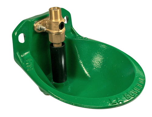 Abreuvoir éducatif en fonte revêtement polycoat, spécialement adapté aux petits museaux (veaux, moutons, chèvres). Une petite réserve d'eau située sous la robinetterie incite les animaux à pousser le tube. Robinetterie laiton avec raccordement 1/2'', par le haut. Débit réglable facilement sans démontage, jusqu'à 8 L/min. Bride de fixation sur poteau Ø 102 mm A331 (réf. 11659) en option.