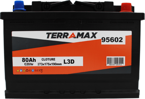 Batterie de clôture. Décharge lente. Tension : 12 V. Capacité : 80 Ah. Dimensions : 278x175x190 mm. Bornes : longueur. Polarité + : à droite.