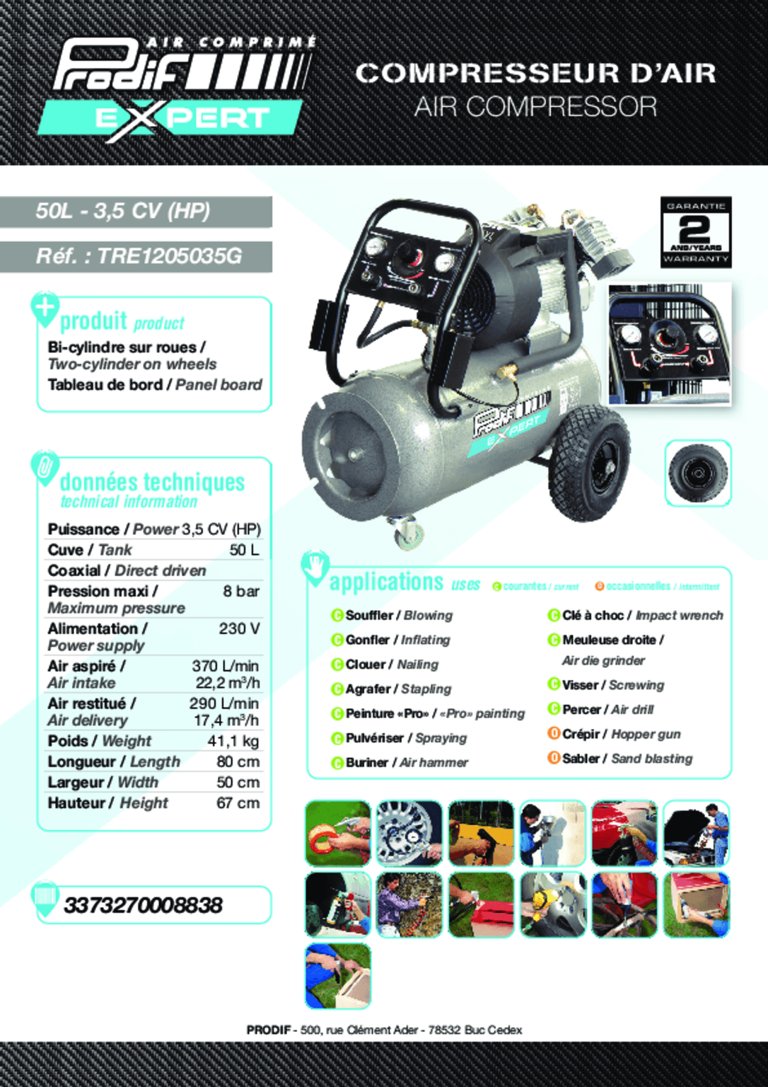 - Compresseur monophasé 50 L 8 Bar 3,5 CV