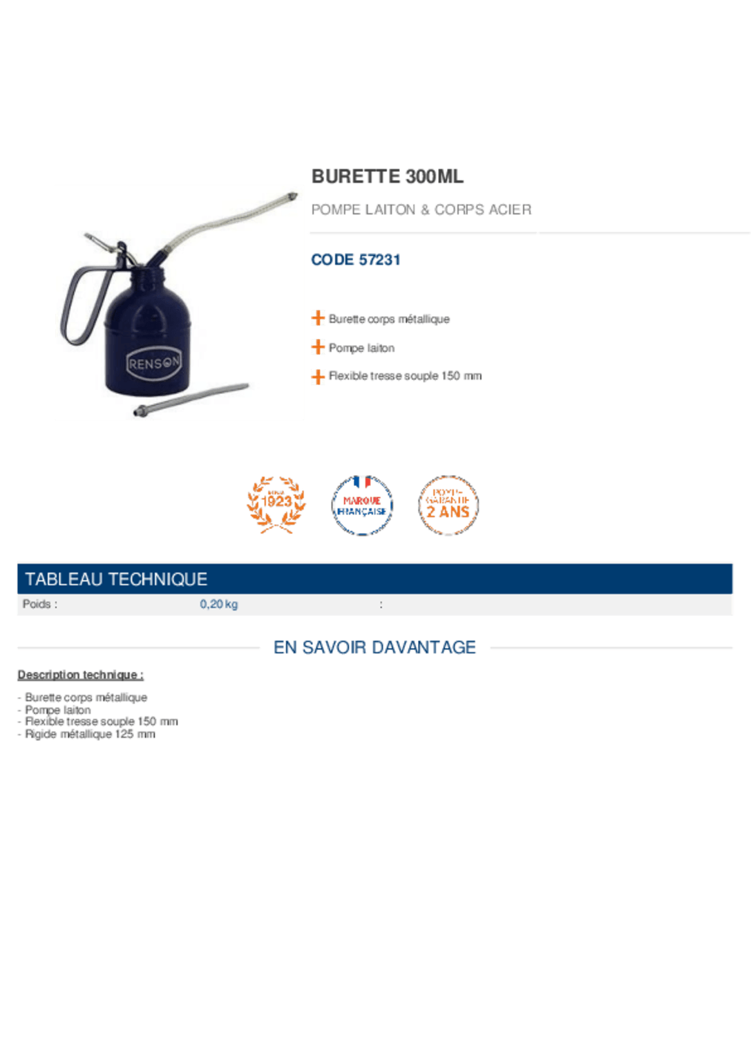 Capacité : 300 ml. Corps métallique. Pompe laiton. Livrée avec flexible tresse souple et rigide métallique.