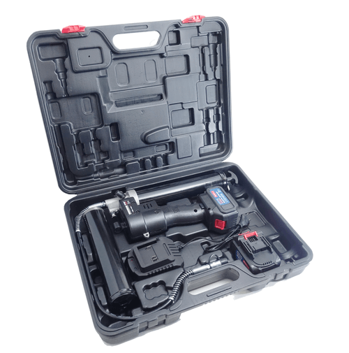 18 V. Compatible avec cartouche de graisse à visser ou standard de 400 g. Mallette rigide compartimentée comprenant : 1 pompe à graisse électrique 18 V, 2 batteries 18 V Li-ion rechargeables, 1 chargeur de batteries 220 V, 1 indicateur de charge, 1 flexible, 1 agrafe 4 mors. Batteries chargées en 2 h. Pression de travail : 400 Bar. Débit de graisse par minute : 85 g à 70 bar.