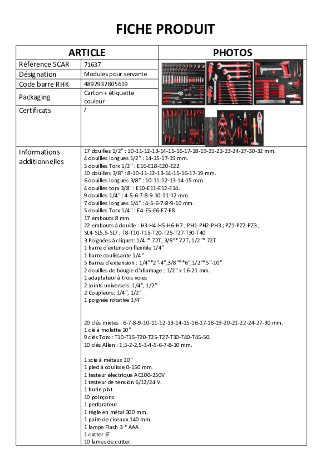 Clés : 20 mixtes, 1 à molette 10'', 9 torx, 10 allen.