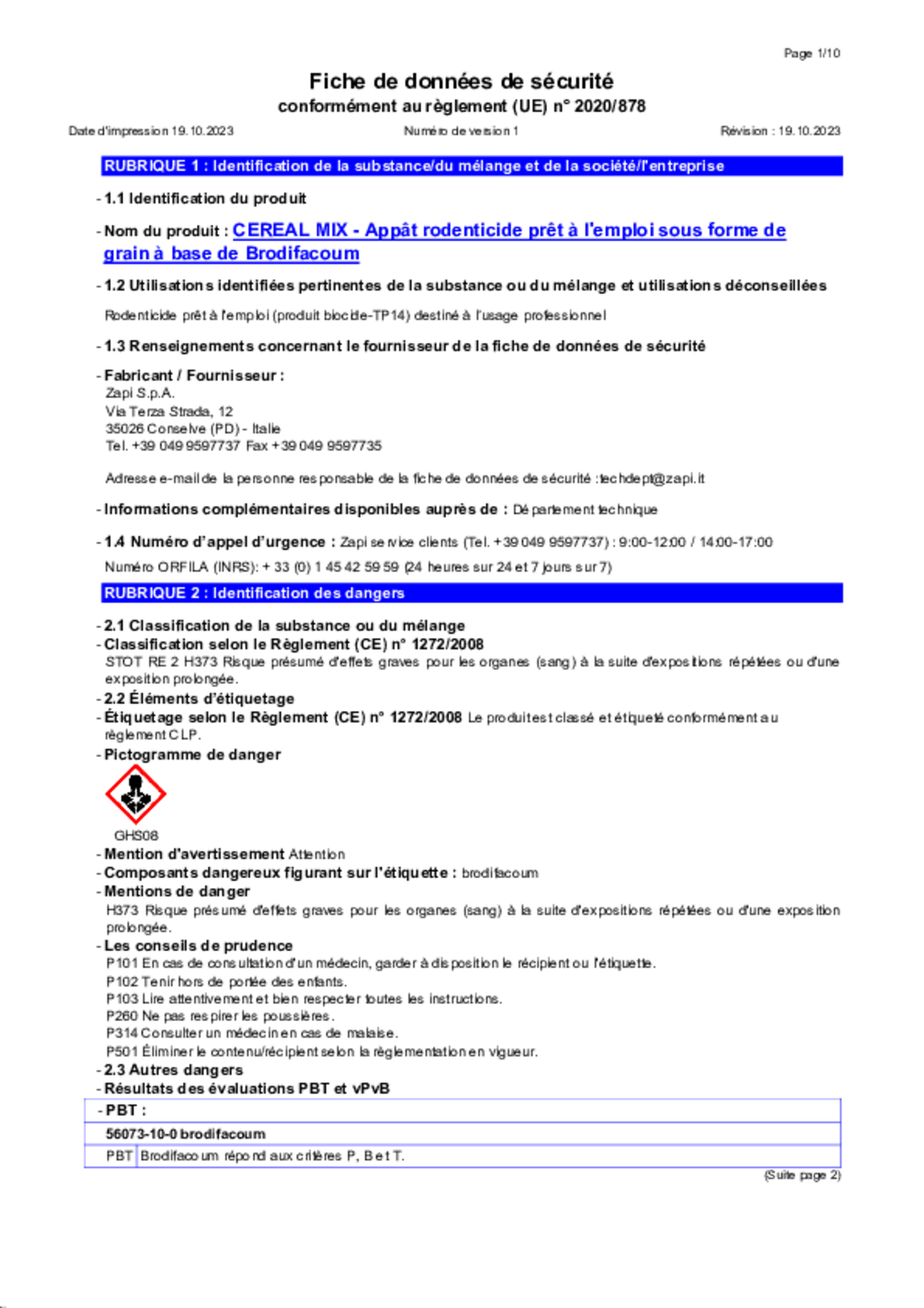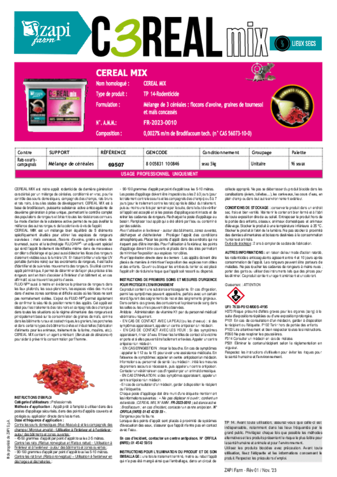 Composition : Matière active, Brodifacoum à 27 ppm (meilleure DL 50).