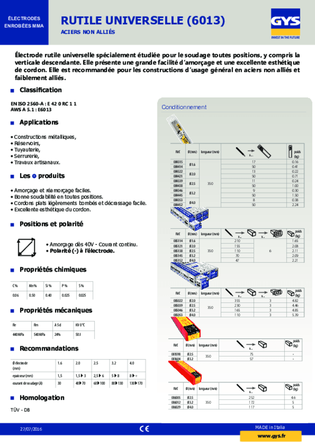 316L. A enrobage rutilo-basique à très basse teneur en carbone. Ø 2,5 x 300 x 30.