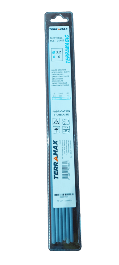 Multi-usages. À enrobage rutilo-basique. Destinées au soudage des Aciers-Inox-Galva. Très hautes caractéristiques mécaniques, elle permet d'assembler des aciers difficilement soudables. Diamètre : 3,2 mm. Longueur : 350 mm. Blister de 6 pièces.